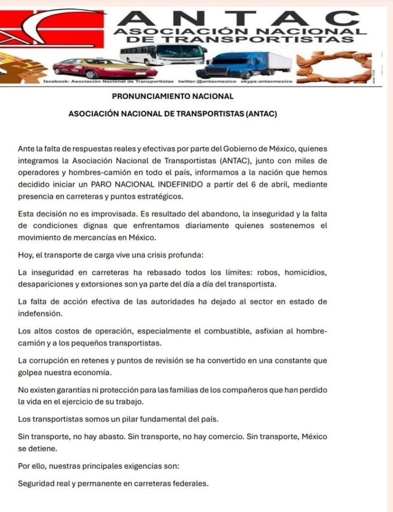 La Asociación Nacional de Transportistas (ANTAC) y el Frente Nacional para el Rescate del Campo Mexicano (FNRCM) señalaron que habrá bloqueos carreteros en distintos puntos del país desde temprana hora de este día.