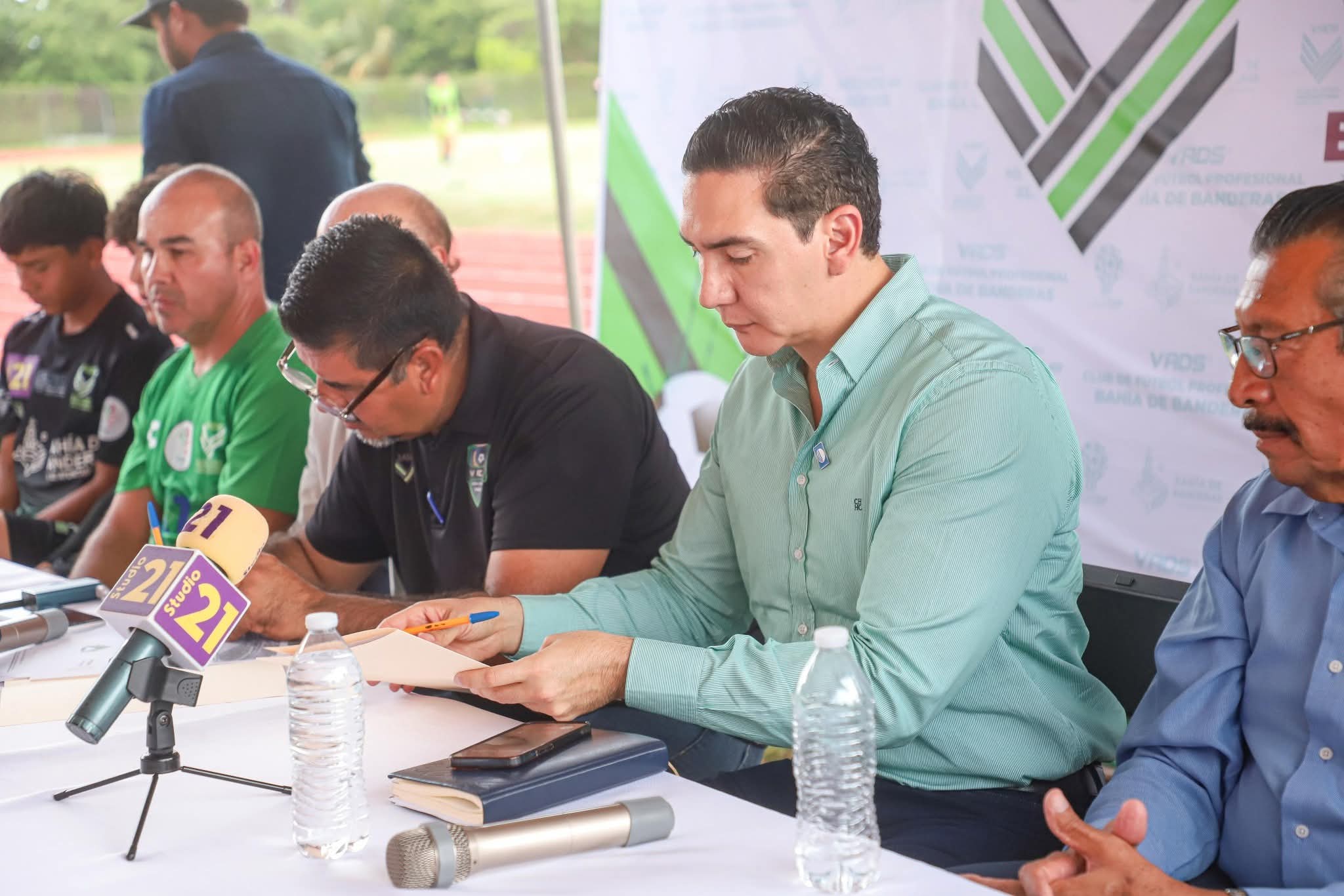 El presidente municipal de Bahía de Banderas, Héctor Javier Santana García, encabezó la firma del convenio de colaboración con el Club Vads, equipo de la Tercera División Profesional de la Federación Mexicana de Fútbol, marcando un hecho sin precedentes para el impulso deportivo en el municipio.