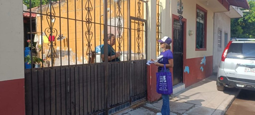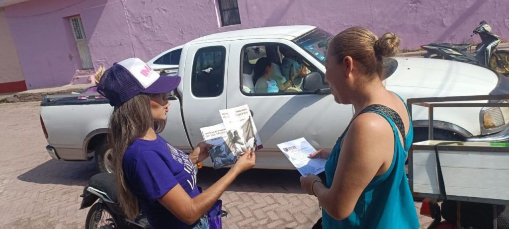 Recorriendo casa por casa en la colonia Terrón Blanco, la Brigada Violeta por las Mujeres compartió información para identificar los diferentes tipos de violencia de género. Asimismo, dio a conocer la Cartilla de los Derechos de las Mujeres y los servicios que ofrece el IMujer Acaponetense y el Centro Libre Acaponeta. Este programa representa un espacio cercano de orientación y apoyo para las mujeres.