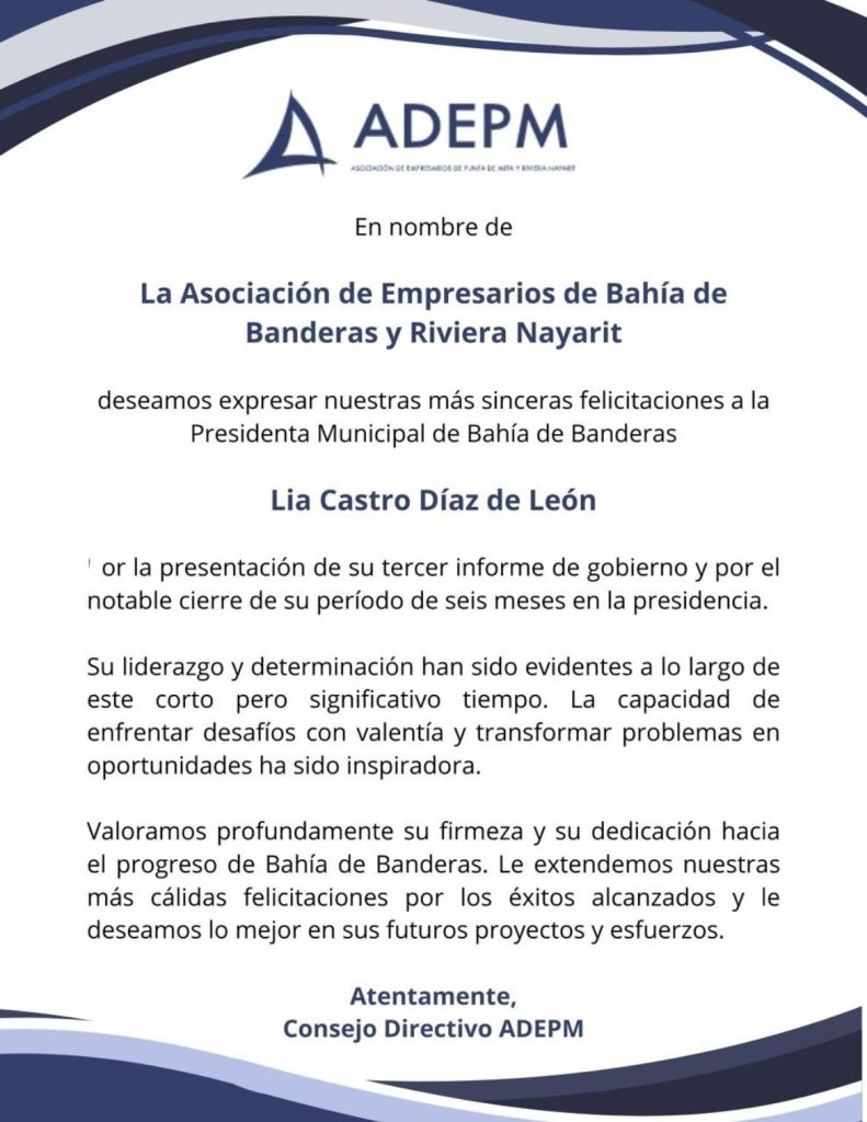 La Asociación de Empresarios de Bahía de Banderas y Riviera Nayarit expresó su reconocimiento y felicitaciones a la presidenta municipal, Lía Saraí Castro Díaz de León, tras la presentación de su Tercer Informe de Gobierno y el exitoso cierre de su periodo de seis meses en la presidencia.