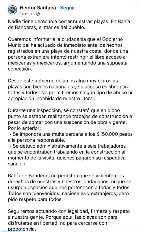 Una mujer de nacionalidad extranjera fue sancionada por el Ayuntamiento de Bahía de Banderas con una multa cercana a los 150 mil pesos, luego de que intentara correr de manera prepotente a tres personas mexicanas que disfrutaban de la playa frente a su propiedad en construcción, en la comunidad de San Pancho.