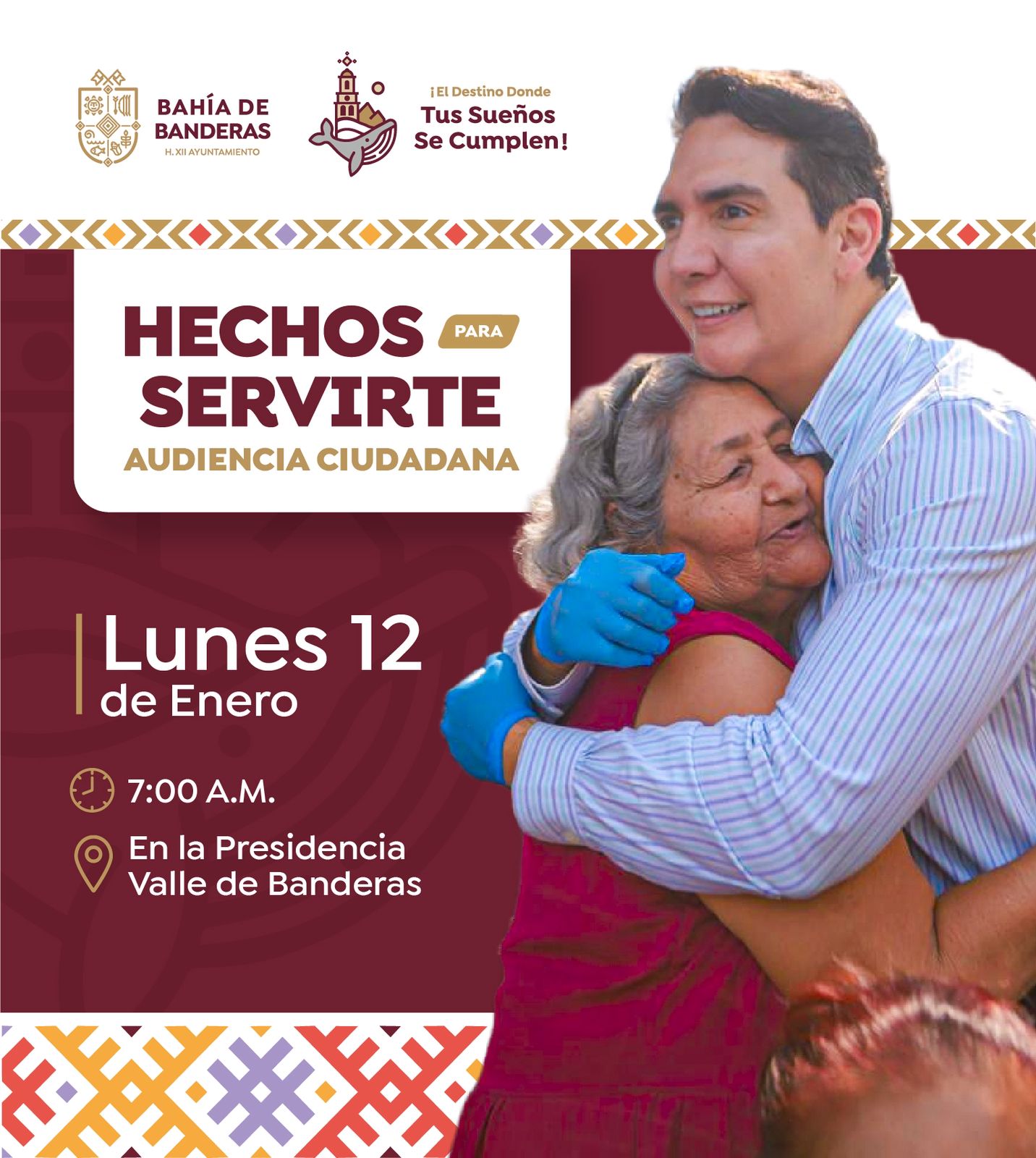 El presidente municipal de Bahía de Banderas, Héctor Santana, reanuda el contacto directo con la población a través de las Audiencias Ciudadanas, por lo que se le invita a toda la ciudadanía a sumarse a esta jornada, que se llevará a cabo este próximo lunes 12 de enero, en punto de las 7:00 a.m, en las instalaciones de la Presidencia Municipal de Valle de Banderas.