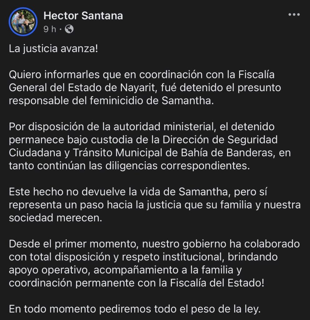En redes sociales, el alcalde de Bahía de Banderas, Héctor Santana, informó que la Fiscalía General del Estado de Nayarit logró la captura del presunto feminicida de Samantha Estefanía, joven vecina de San José del Valle, quien fue localizada sin vida la noche del lunes en el domicilio de su expareja.