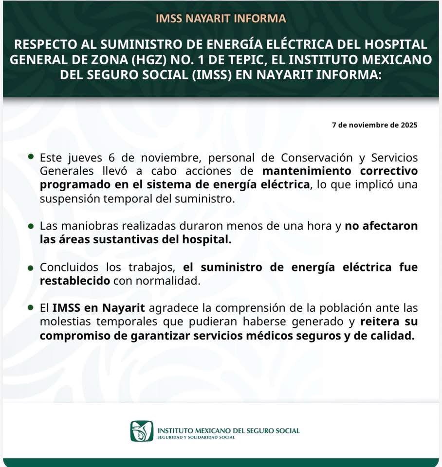 El Instituto Mexicano del Seguro Social informó que la suspensión de energía eléctrica registrada en el Hospital General de Zona 1 en Tepic no fue un corte realizado por la CFE, como se difundió en redes sociales, sino parte de trabajos de mantenimiento correctivo en el sistema eléctrico. Las maniobras, realizadas el pasado jueves 6 de noviembre por personal de conservación y servicios generales, duraron aproximadamente una hora y no afectaron las áreas sustantivas del hospital.