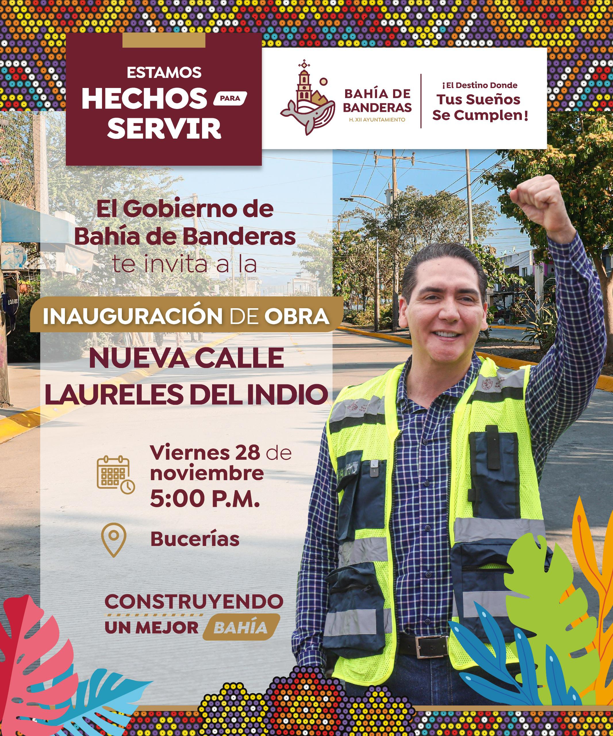 El Gobierno de Bahía de Banderas, que encabeza el presidente municipal Héctor Santana, invita a la ciudadanía a participar en la inauguración de una nueva obra, se trata de la calle Laureles del Indio en Bucerías, la cita es hoy 28 de noviembre en punto de las 5:00 p.m.