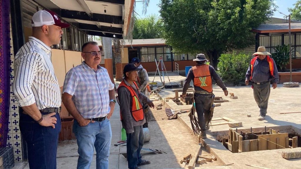 El alcalde supervisa la construcción de una techumbre que beneficiará a la comunidad estudiantil.