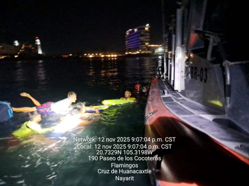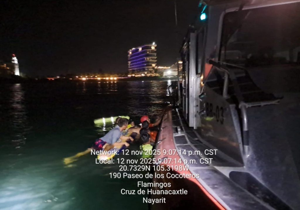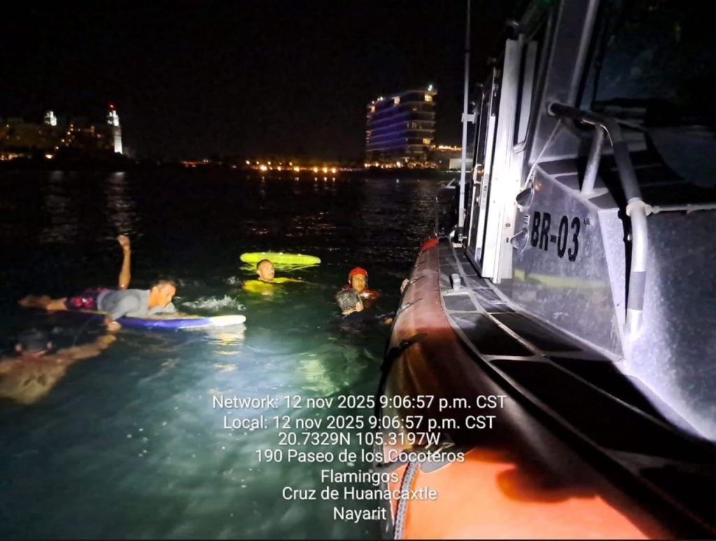 La Marina y elementos de Guardavidas del Estado de Nayarit rescataron a cuatro personas tras el hundimiento de una embarcación en Bahía de Banderas. Jesús Arizmendi, de 54 años, alertó desde la orilla que a un kilómetro mar adentro se encontraban sus tres acompañantes, quienes lograron mantenerse a flote apoyados en una hielera. Con el apoyo de una embarcación tipo Defender de la Armada de México, los tripulantes fueron trasladados al muelle naval, donde recibieron atención médica y se confirmó que se encontraban fuera de peligro.