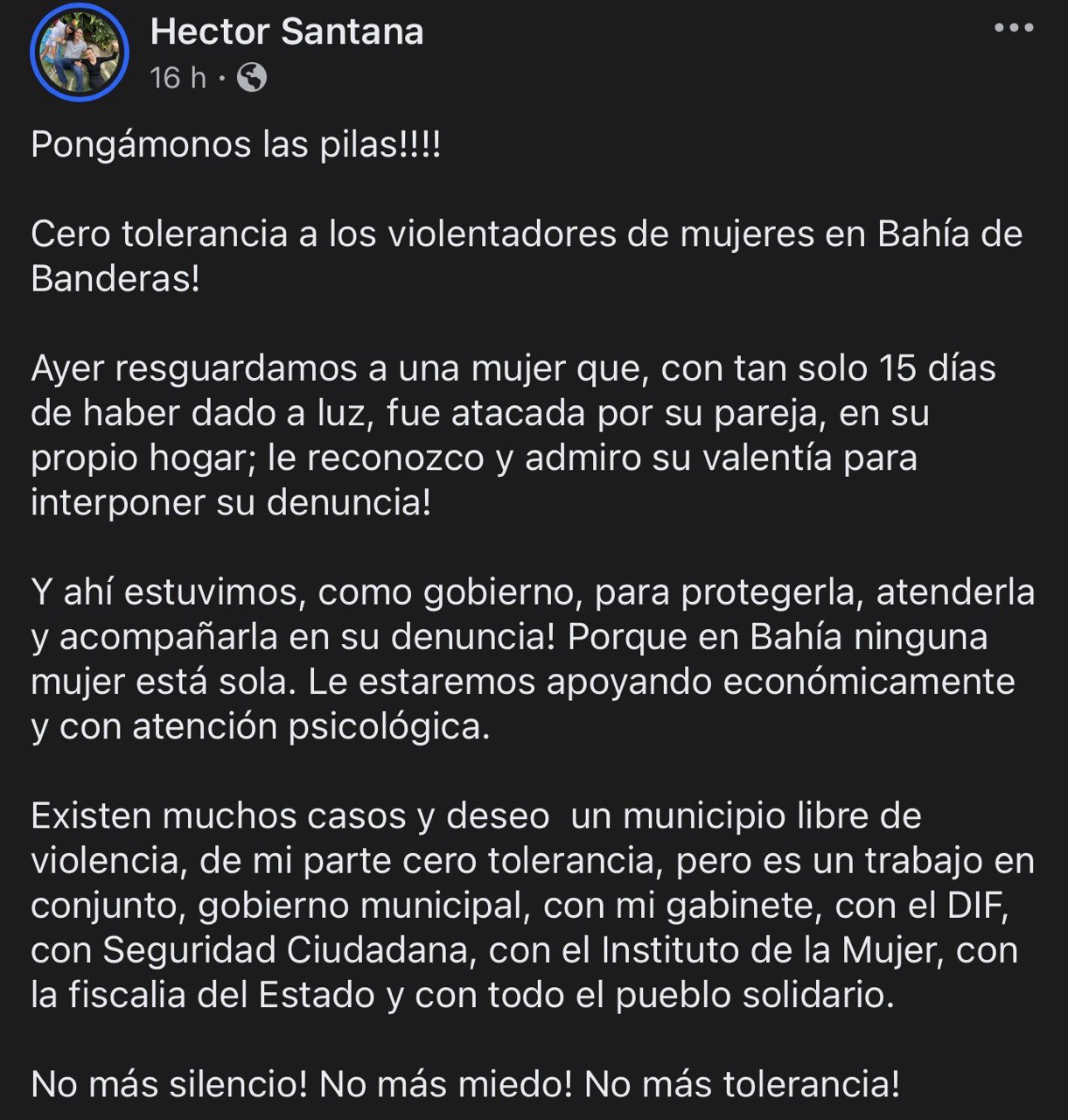 A través de sus redes sociales, el presidente municipal de Bahía de Banderas, Héctor Santana, dio a conocer el caso de una mujer que fue agredida por su pareja en su propio hogar, apenas dos semanas después de haber dado a luz.