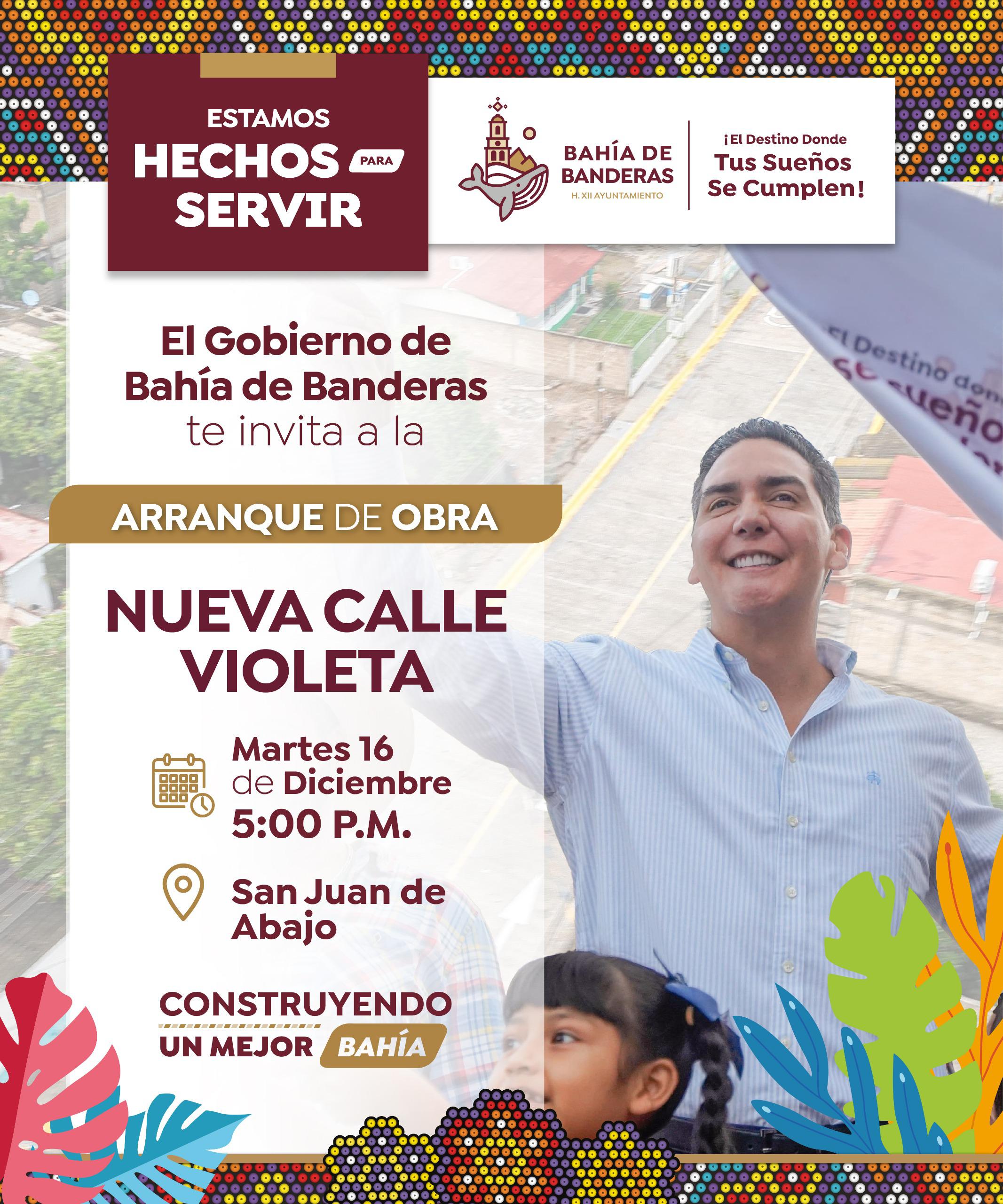 El Gobierno de Bahía de Banderas, encabezado por el presidente municipal Héctor Santana, invita cordialmente a la ciudadanía al arranque de obra de la Nueva Calle Violeta.